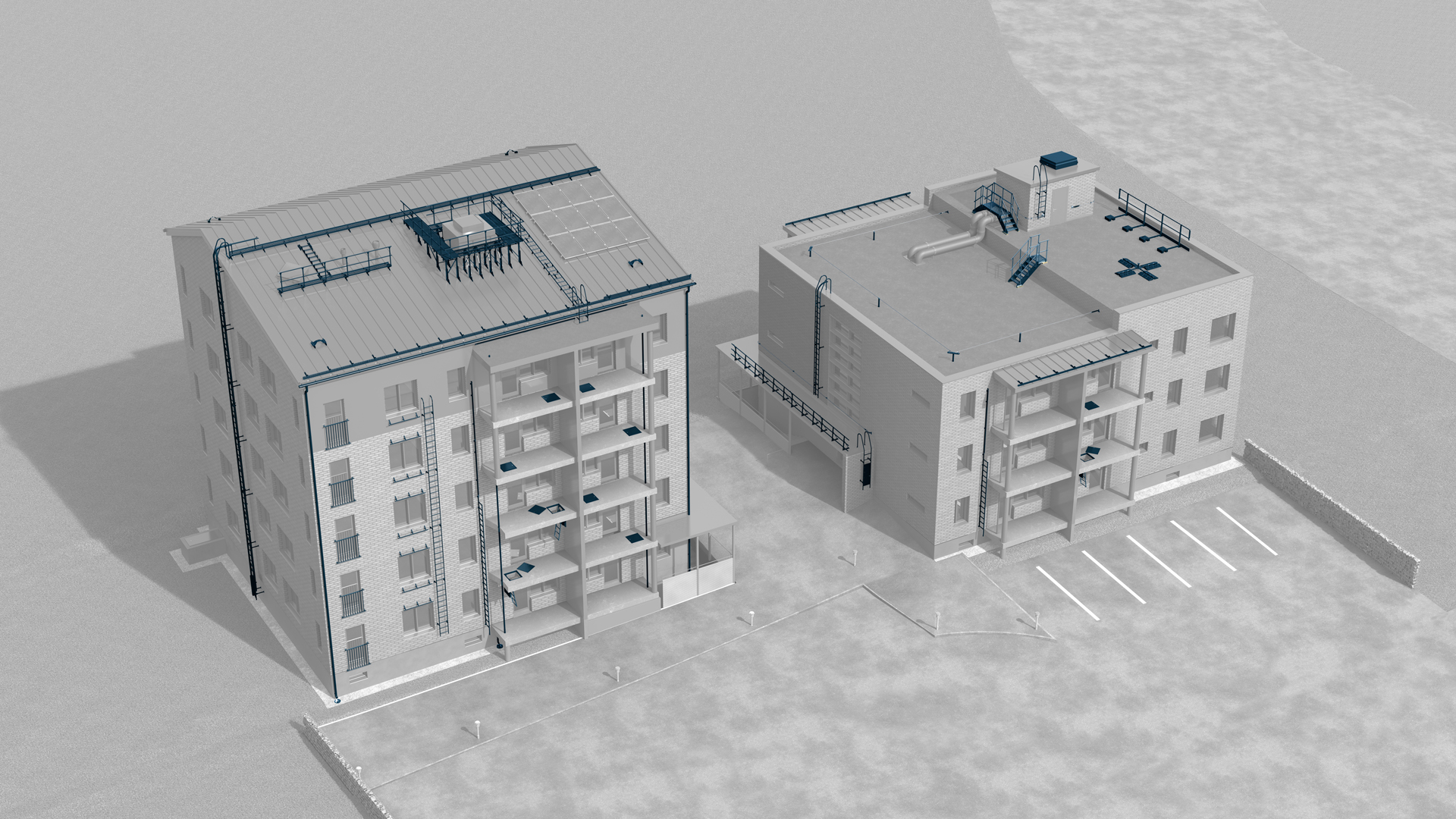 Rakenteiden läpi kulkevien tuotteiden 3D-visualisointi. Läpileikkaukset ja rakennekuvat selkeästi esitettynä. Kuvassa kerrostalon parvekkeen lattiaelementin läpi kulkeva sadevesijärjestelmä.